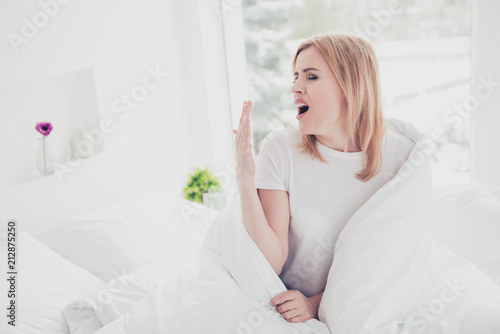 Young cute smiling blonde woman awakening in bed on white sheets covered wrapped in blanket yawning in bedroom with white interior. Flowers in vases on background