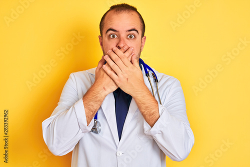 Young doctor man wearing coat and stethoscope standing over isolated yellow background shocked covering mouth with hands for mistake. Secret concept.