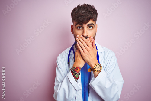 Young doctor man with tattoo wearing stethocope standing over isolated pink background shocked covering mouth with hands for mistake. Secret concept.