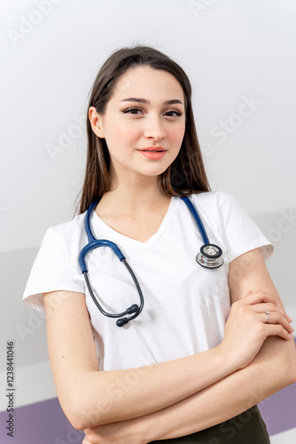 Young doctor with stethoscope. A confident young woman in a white shirt and stethoscope stands ready to assist patients in healthcare.