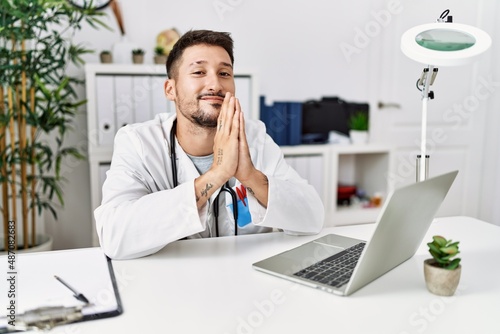 Young doctor working at the clinic using computer laptop praying with hands together asking for forgiveness smiling confident.