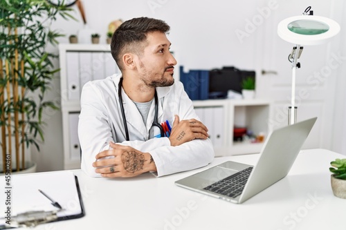 Young doctor working at the clinic using computer laptop smiling looking to the side and staring away thinking.