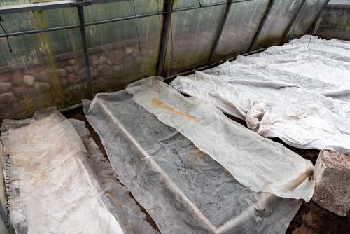 Young early spring tomato seedlings growing in the soil under the transparent coverage in greenhouse. Planting vegetables.