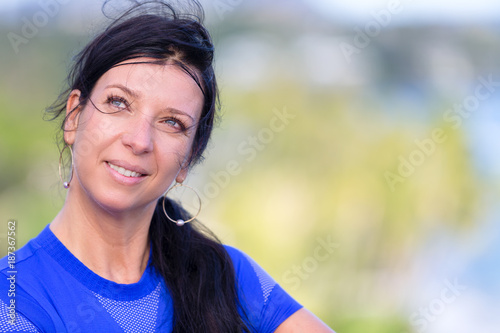 Young Eastern European woman looking up high