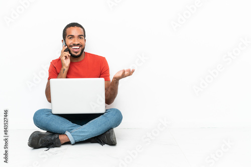 Young Ecuadorian man with a laptop sitting on the floor isolated on white background keeping a conversation with the mobile phone with someone