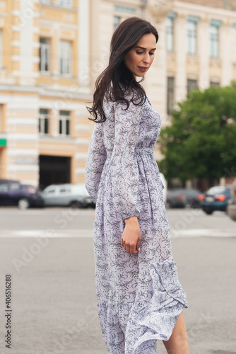 Young elegant girl posing at city street. Pretty beautiful business woman in elegant dress against city background.