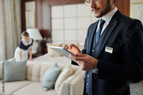 Young elegant manager of luxurious hotel using tablet against chambermaid changing bedclothes and preparing room for new guests