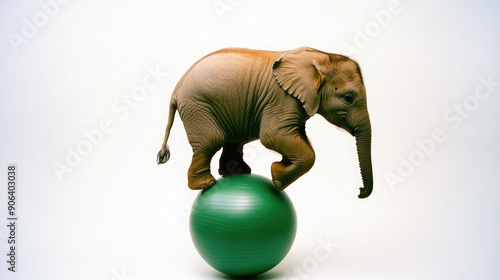 Young Elephant Balancing Skillfully on a Green Exercise Ball in a Bright Studio