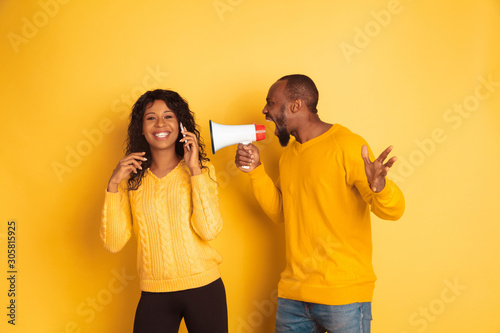 Young emotional african-american man and woman in bright casual clothes on yellow background. Concept of human emotions, facial expession, relations, ad. He's calling with mouthpeace, she's ignoring.