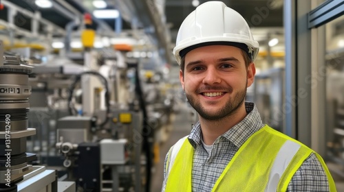 Young engineer smiles in a factory setting