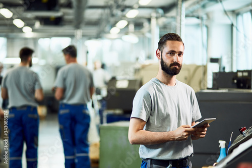 Young engineer using touchpad while working in industrial facility.