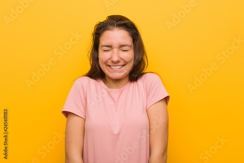 Young european woman isolated over yellow background laughs and closes eyes, feels relaxed and happy.