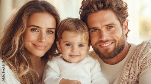 Young family enjoys the comfort of home, cuddling with their child on the couch