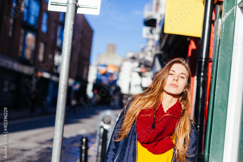 Young Fashionable Blonde Woman Walking on the Sidewalk