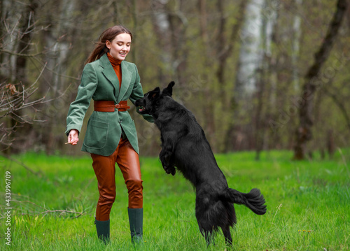 Young fashionable woman, in country style, training black retriever dog in spring forest on green grass
