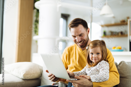 Young father and his small daughter using computer on sofa at home. Little girl is looking at camera
