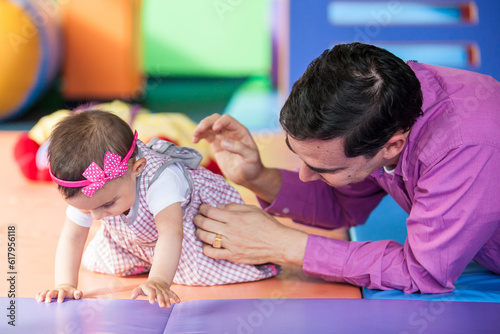 Young father playing with his baby daughter. Early stimulation for toddlers concept.