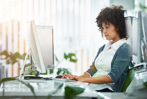 Young female designer working at her computer by a desk in a modern office. Creative business woman in design typing advertising and marketing designs on her pc keyboard at the workplace