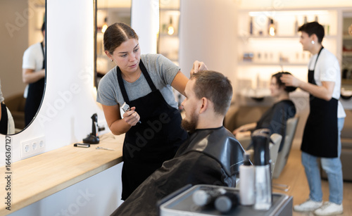 Young female hairdresser stylist gives haircut to young male client in beauty salon
