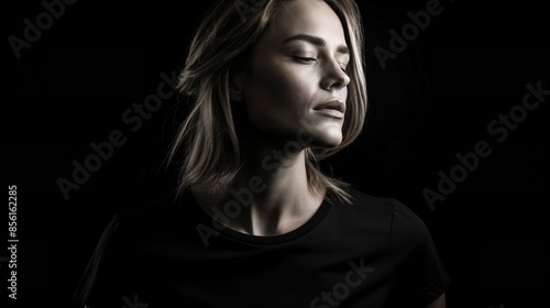 Young female in a casual black t-shirt, monochrome setting, studio shot, soft shadows, contemplative look, front perspective