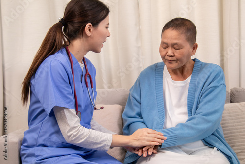 Young female nurse holding hands with senior woman, both smiling with trust and warmth during health support session in cozy home setting, healthcare, caregiver, take care, consult.