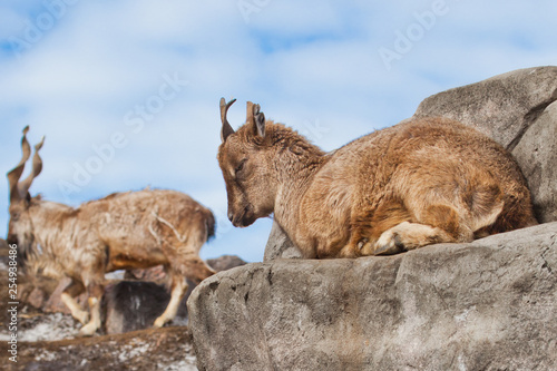 Young female of a mountain goat (Markhoor) lying on a rock on a rock, blue sky,