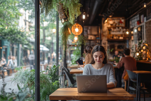 Young female professional is focused on her work, typing on her laptop in a trendy coffee shop with natural light and lush greenery