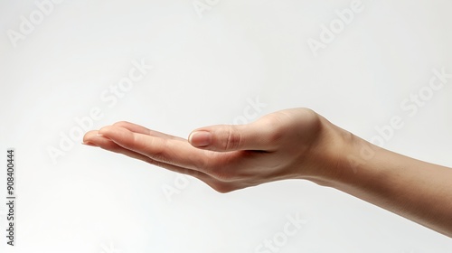 Young female right hand hold something medium sized isolated on white : Generative AI