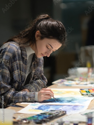 young female student having classes at art studio learning how to draw landscapes trying to mix different watercolors on cardboard concentrated woman with dark hair dressed casually painting no logos