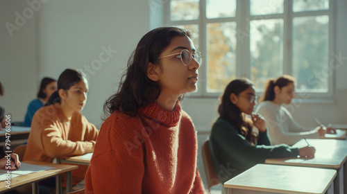 Young female student sitting in classroom, listening to professor. Indian girl attending lecture at college, school lesson. University students studying in class, learning