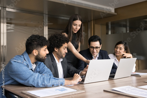 Young female, team leader explaining tasks, new software or corporate platform, brainstorming, working together with multinational teammates gathered in boardroom using laptops. Mentorships, teamwork