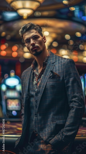 Young fit and attractive man model wearing stylish clothes with strict look in casino interior, bright image, blurred background