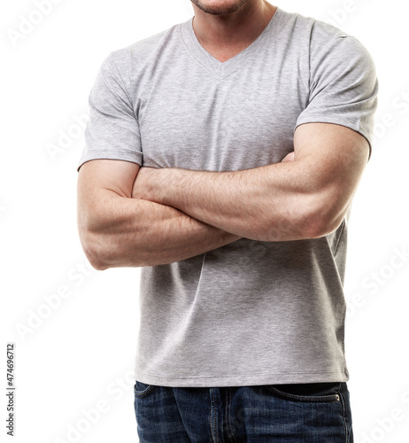 Young fit man wearing blank heather grey shortsleeve V-neck T-Shirt standing with arms crossed confident. Mock up template isolated on a white background