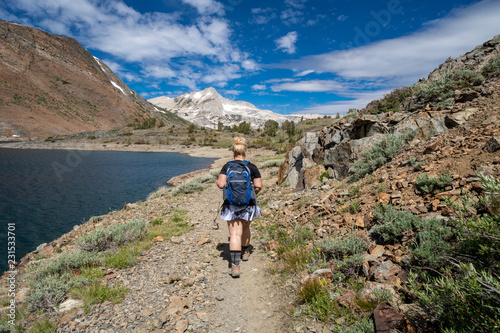 Young fit woman backpacker hiker on a trail in the Eastern Sierra Nevada mountains. Concept for wanderlust, lost, solo journey