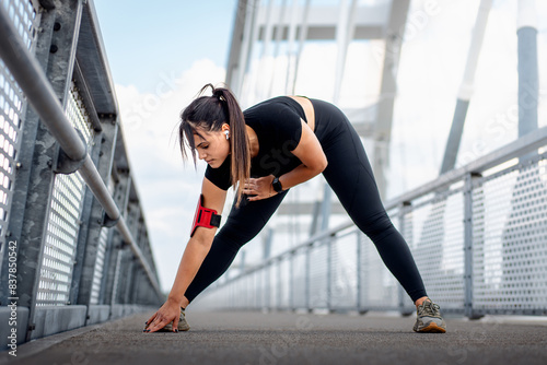 Young fitness woman in black sport outfit preparing for a run stretching her muscles at bridge.