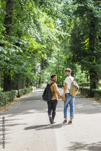 Young gay couple with backpacks walking hand in hand on a road