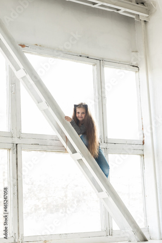 Young girl child climbing on high balk. Danger and hazard concept. Children home hazards. Staged photo.