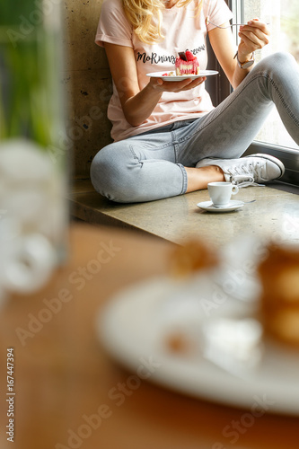 Young girl eating small raspberry cake in Italian restaurant.