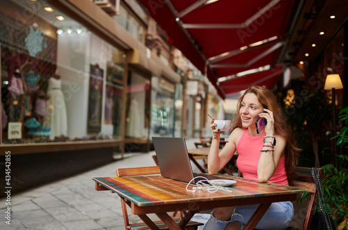 Young girl having tea in a coffee shop. Working with laptop and using a smartphone