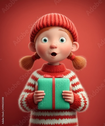 Young girl holding a wrapped gift with a ribbon, isolated on white background, studio lighting.