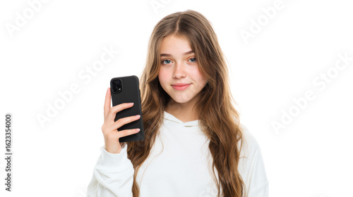 Young girl holding smartphone, smiling at camera, white isolate background.