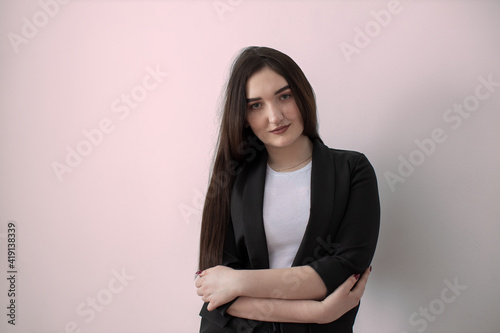 Young girl in a black jacket and white blouse standind with her arms crossed.