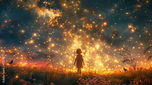 Young Girl in a Flower Field Under a Starry Night Sky Filled with Magic and Mystery