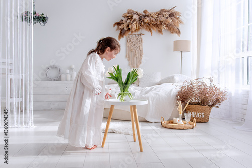 Young girl in a white dress is bending over to smell a bouquet of fresh white tulips placed on a small table in a bright, bohemian-style bedroom with a comfortable bed and natural decorations