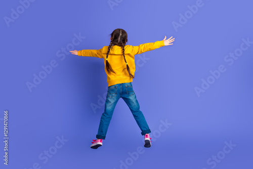 Young girl in casual yellow sweatshirt and jeans enthusiastically jumping against a vivid violet background embracing joy.