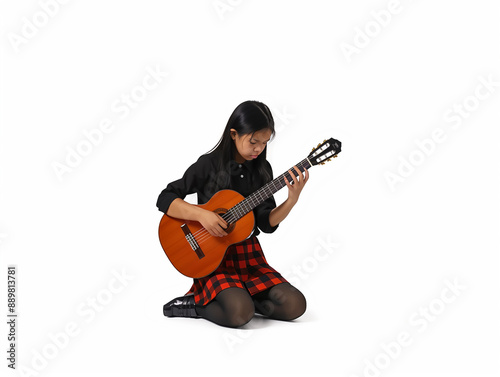 young girl is sit playing the guitar with white background