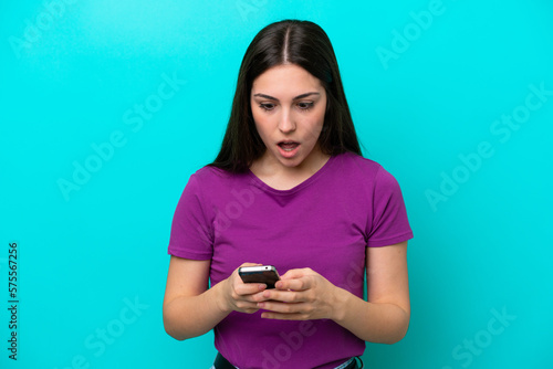 Young girl isolated on blue background looking at the camera while using the mobile with surprised expression