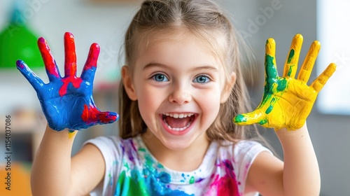 Young girl joyfully displays her hands covered in colorful paint while engaging in art