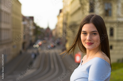 Young girl portrait in city in spring