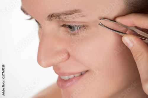 Young girl pulls out her eyebrows with tweezers metal on a white background